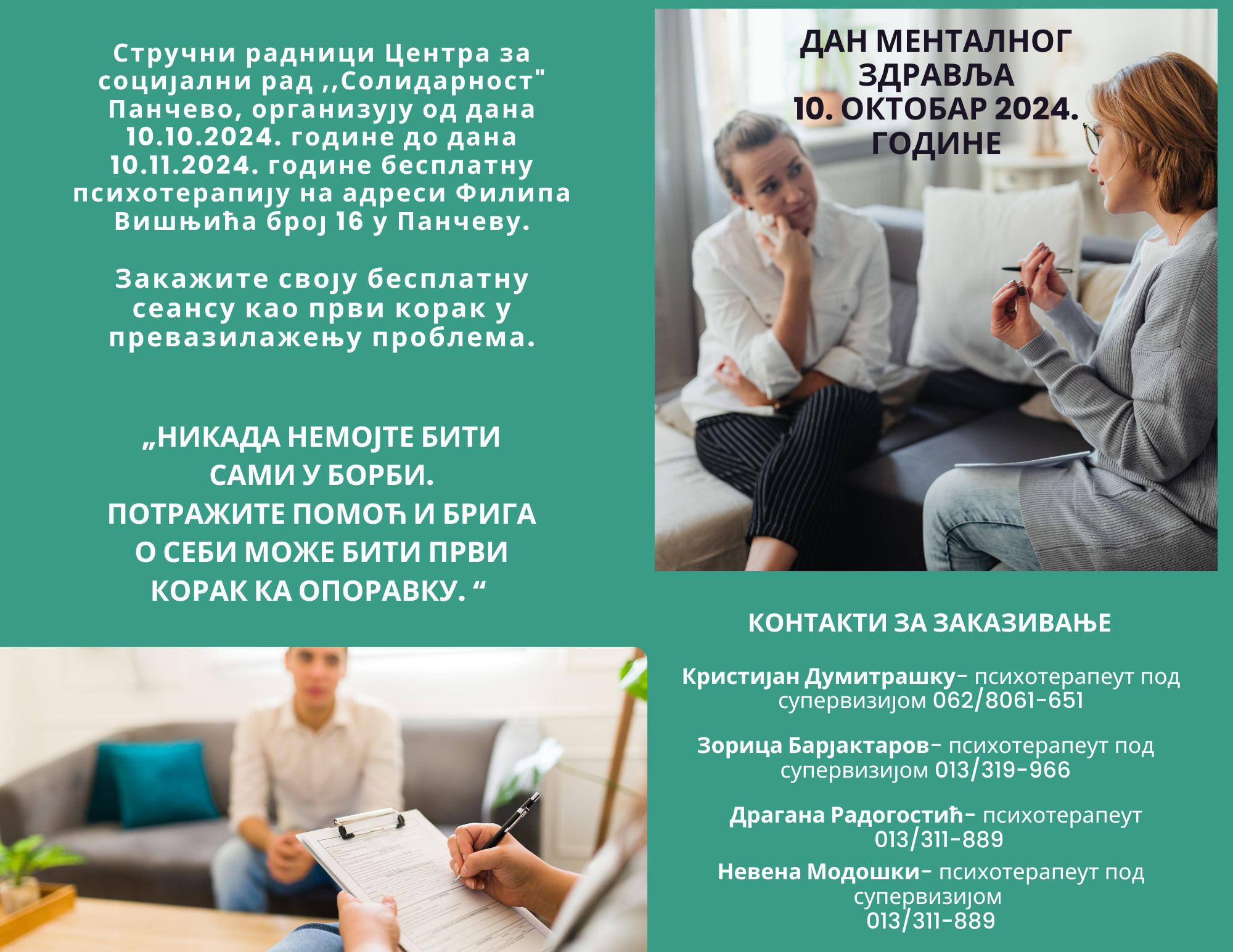 Центар за социјални рад ,,Солидарност" Панчево, у сарадњи са Градом Панчевом, организује од дана 01.10.2024. године до дана 31.12.2024. године бесплатно Саветовалиште за жртве насиља у породици, сваке среде од 15:30 до 18:30 часова, на адреси Филипа Вишњића број 16 у Панчеву. ПРОЈКЕТИ- 2024 Центар за социјални рад ,,Солидарност" Панчево, у сарадњи са Градом Панчевом, организује од дана 01.10.2024. године до дана 31.12.2024. године бесплатно Саветовалиште за жртве насиља у породици, сваке среде од 15:30 до 18:30 часова, на адреси Филипа Вишњића број 16 у Панчеву.