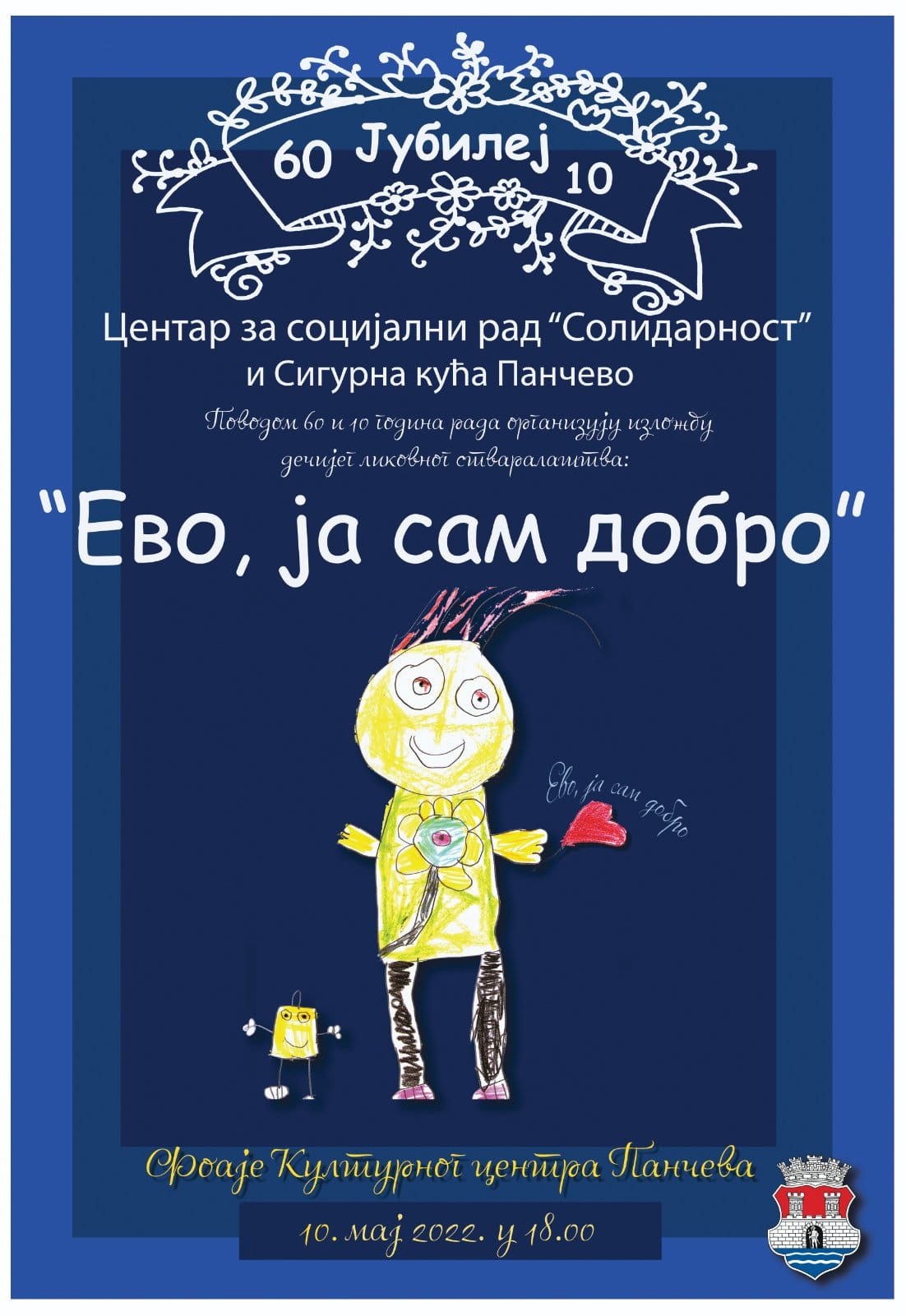 Поводом јубилеја Центра за социјални рад и Сигурне куће Панчево, дана 10.05.2022.год. у фоајеу Културног центра са почетком у 18 часова, биће одржана изложба дечјег ликовног стваралаштва, под називом "Ево, ја сам добро". Улаз је слободан.